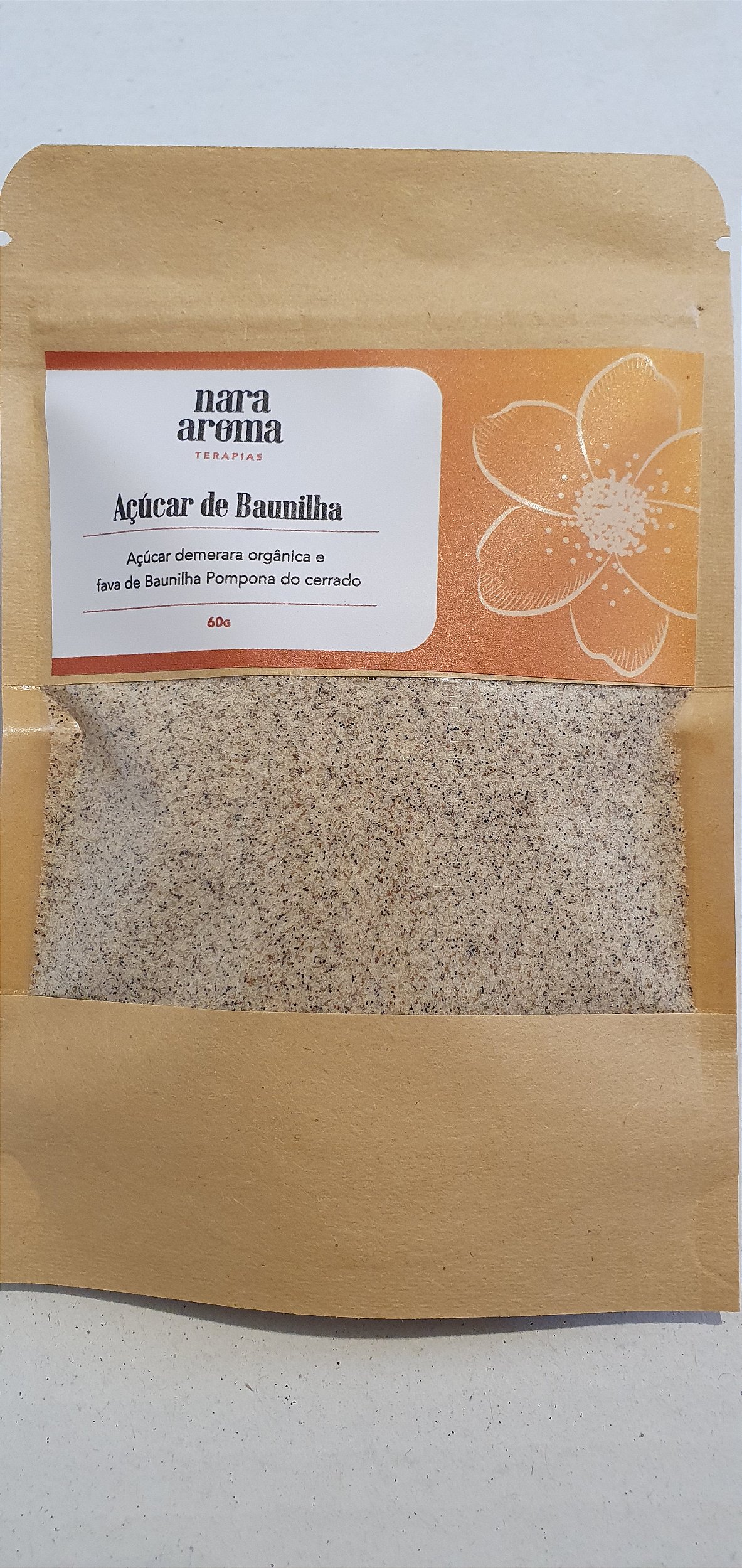Ingredientes: açúcar demerara orgânica e fava de Baunilha Pompona do cerrado.